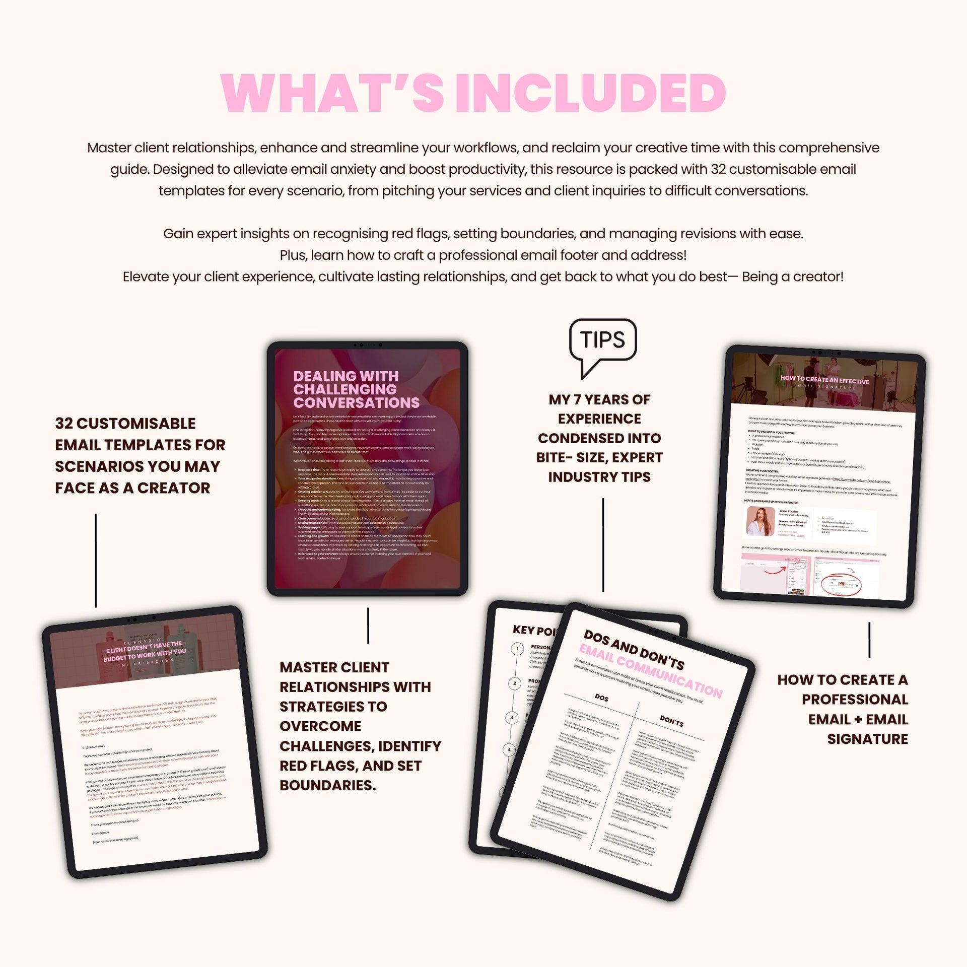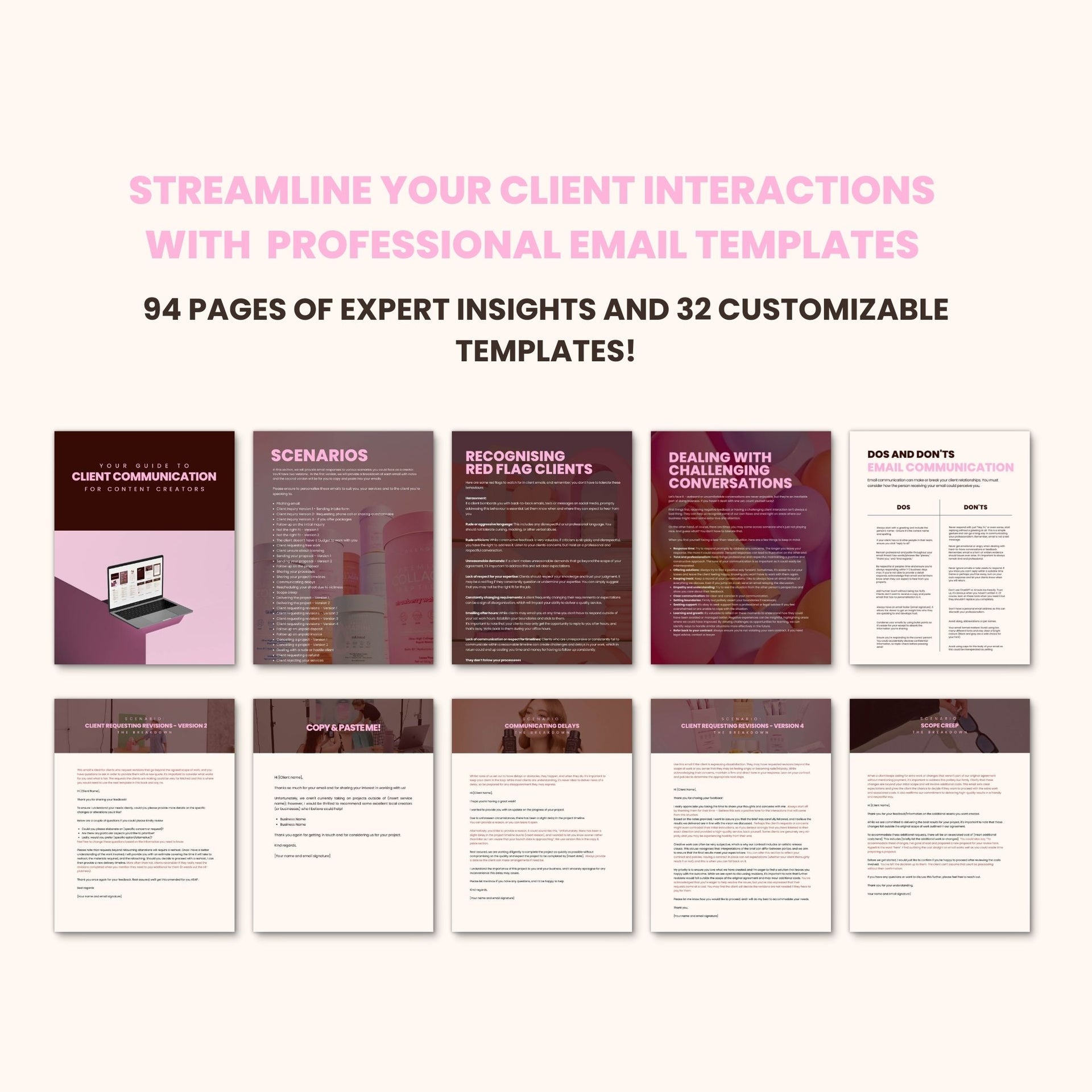 Inside this guide, you’ll unlock my secrets to successful client communication with our extensive collection of email templates, personally curated and proven in our own business. From pitching your services to handling difficult conversations, sending proposals, and effective follow-ups, these templates cover every aspect of client interaction, saving you time and ensuring a professional approach.